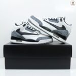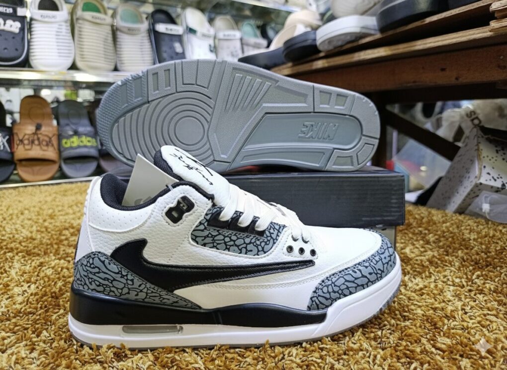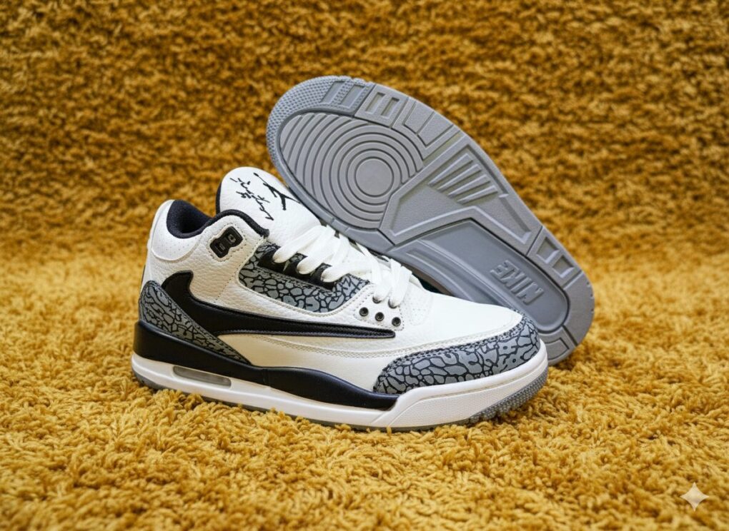 Jordan 3 Retro “Grey Cement Swoosh Edition” হলো ক্লাসিক কালার কম্বিনেশনের একটি মাস্টারপিস। আইকনিক হোয়াইট ও ব্ল্যাক টোনের সমন্বয়ে তৈরি এই জুতোর পাশে যুক্ত হয়েছে স্টাইলিশ ব্ল্যাক নাইকি সুইশ লোগো, যা এটিকে দিয়েছে একদম নতুন ও প্রিমিয়াম লুক। গ্রে এলিফ্যান্ট প্রিন্ট, এয়ার ইউনিট কুশনিং এবং সিগনেচার জাম্পম্যান লোগো মিলে এটি এক অনন্য কালেকশন পিস।