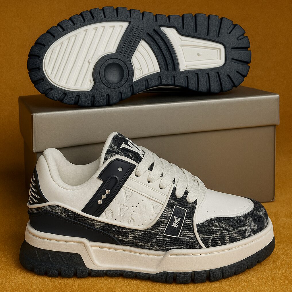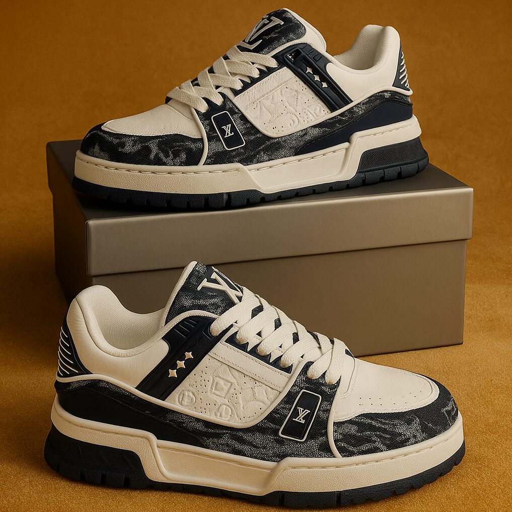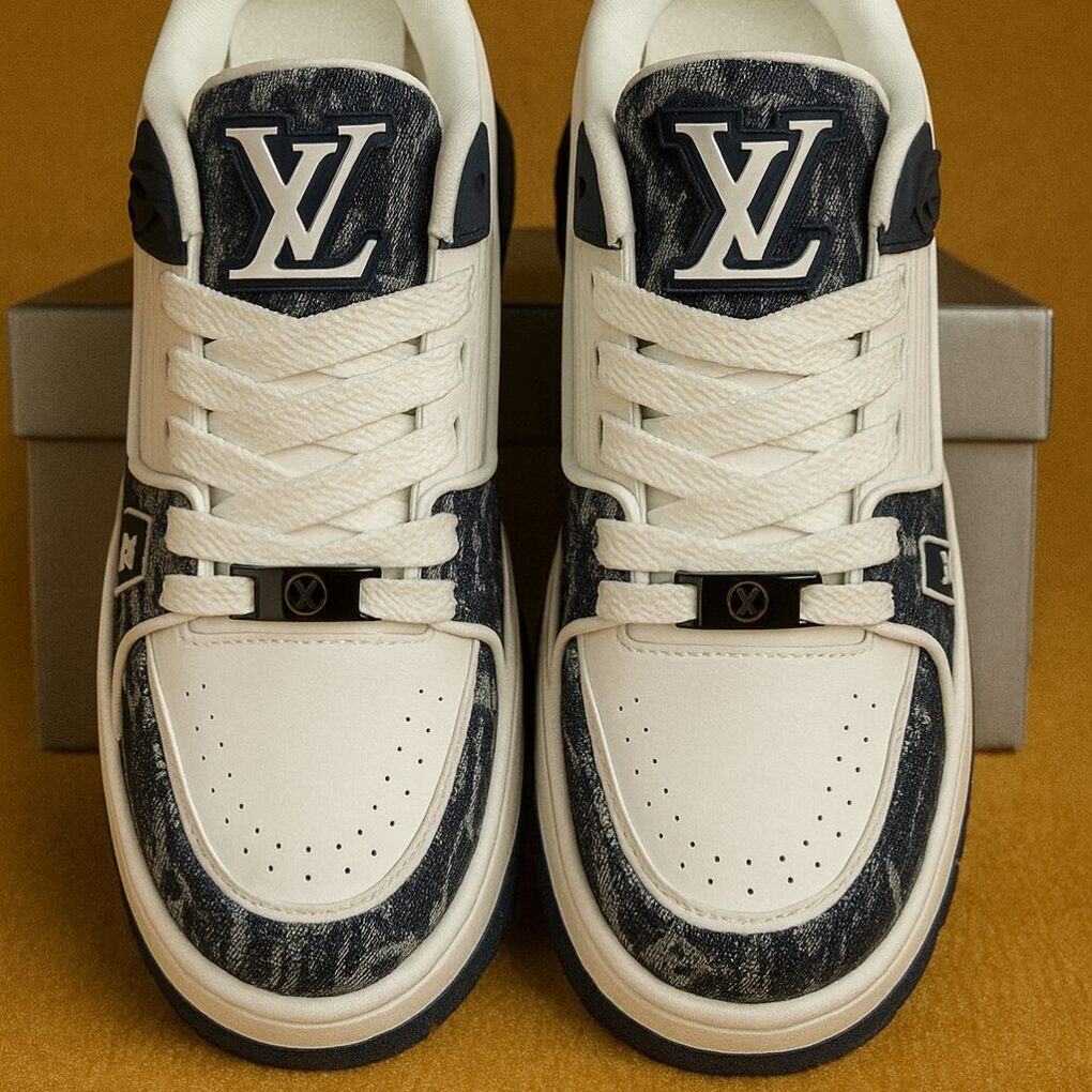 উচ্চমানের LV মনোগ্রাম ডেনিম ফেব্রিক, এর সাথে যুক্ত সাদা জেনুইন লেদার ও নেভি ব্লু অ্যাকসেন্ট, যা দেয় এক অনন্য লাক্সারি লুক। সফট প্যাডেড ইনসোল ও স্টাইলিশ মিডসোল দীর্ঘক্ষণ ব্যবহারে দেয় আরাম, আর শক্তিশালী আউটসোল নিশ্চিত করে টেকসই ব্যবহার।